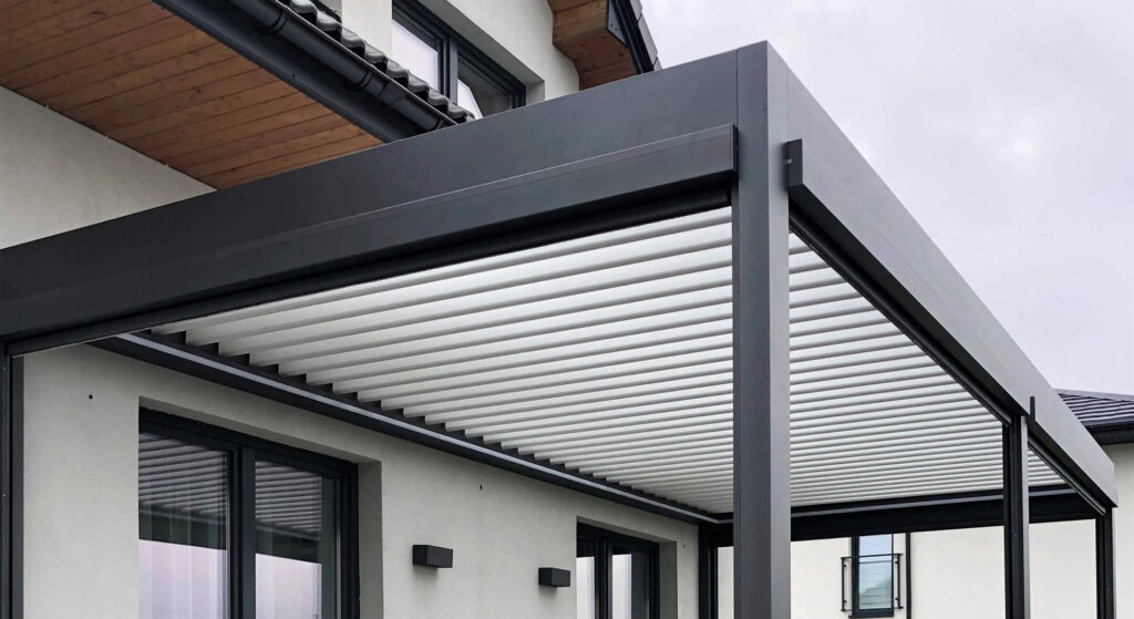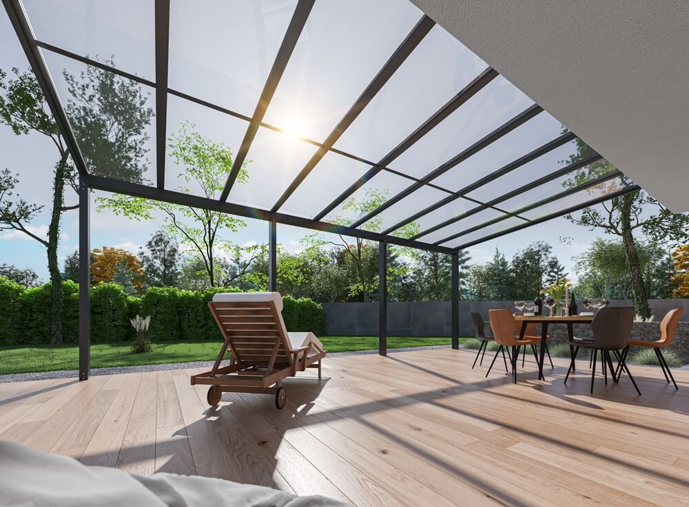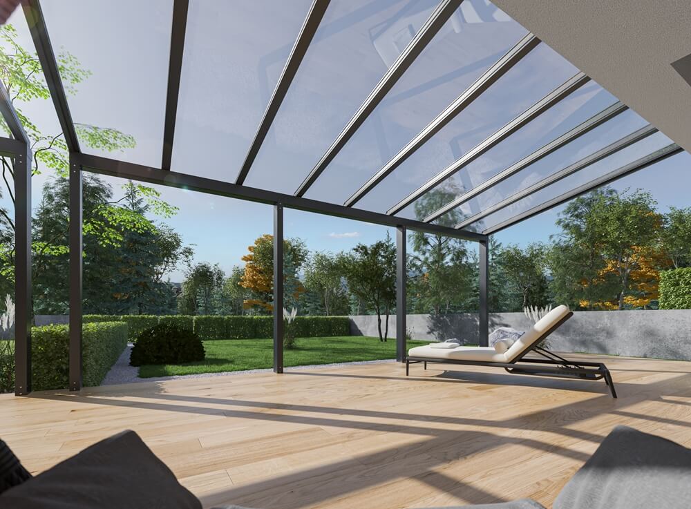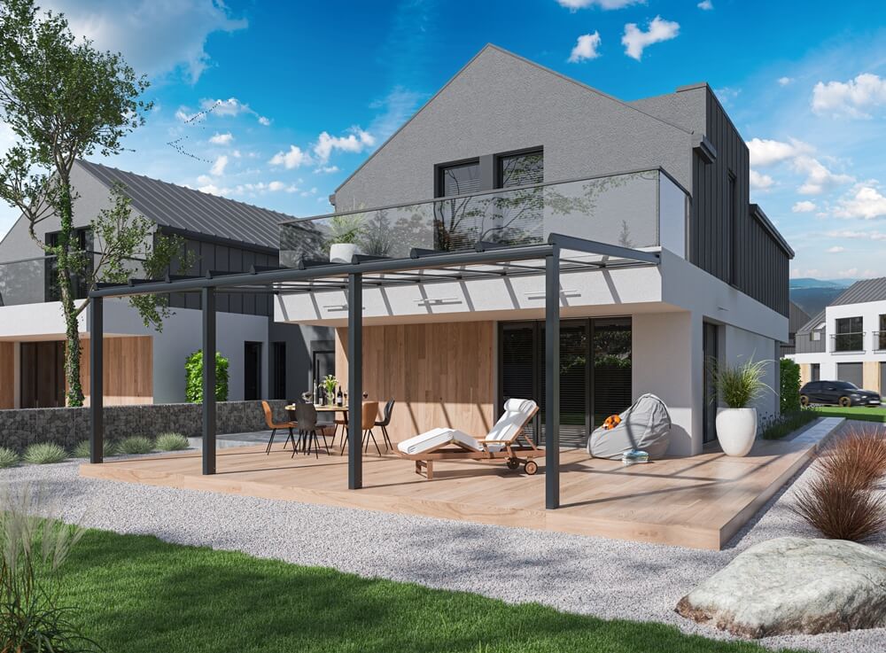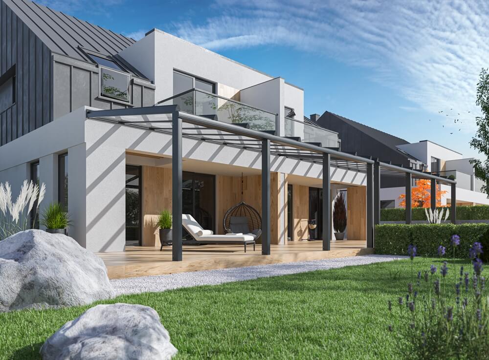 Als Hersteller von Gartenarchitektur mit langjähriger Erfahrung und den Trends im Bauwesen folgend, bieten wir unseren Kunden Terrassendächer aus Aluminium und Glas an. Hergestellt aus pulverbeschichteten Aluminiumprofilen. Systemlösungen ermöglichen uns die Eindeckung des Daches mit 8 mm starkem VSG 44.1 Sicherheitsglas, Vollpolycarbonat und Kammerpolycarbonat mit UV-Filter. Alle Vordächer und Pergolen verfügen über ein integriertes und unsichtbares Wasserablaufsystem. Die bei der Herstellung verwendeten Materialien ermöglichen hervorragende visuelle Effekte. Die Farbe der Pergola wird individuell aus der RAL-Palette bestimmt.